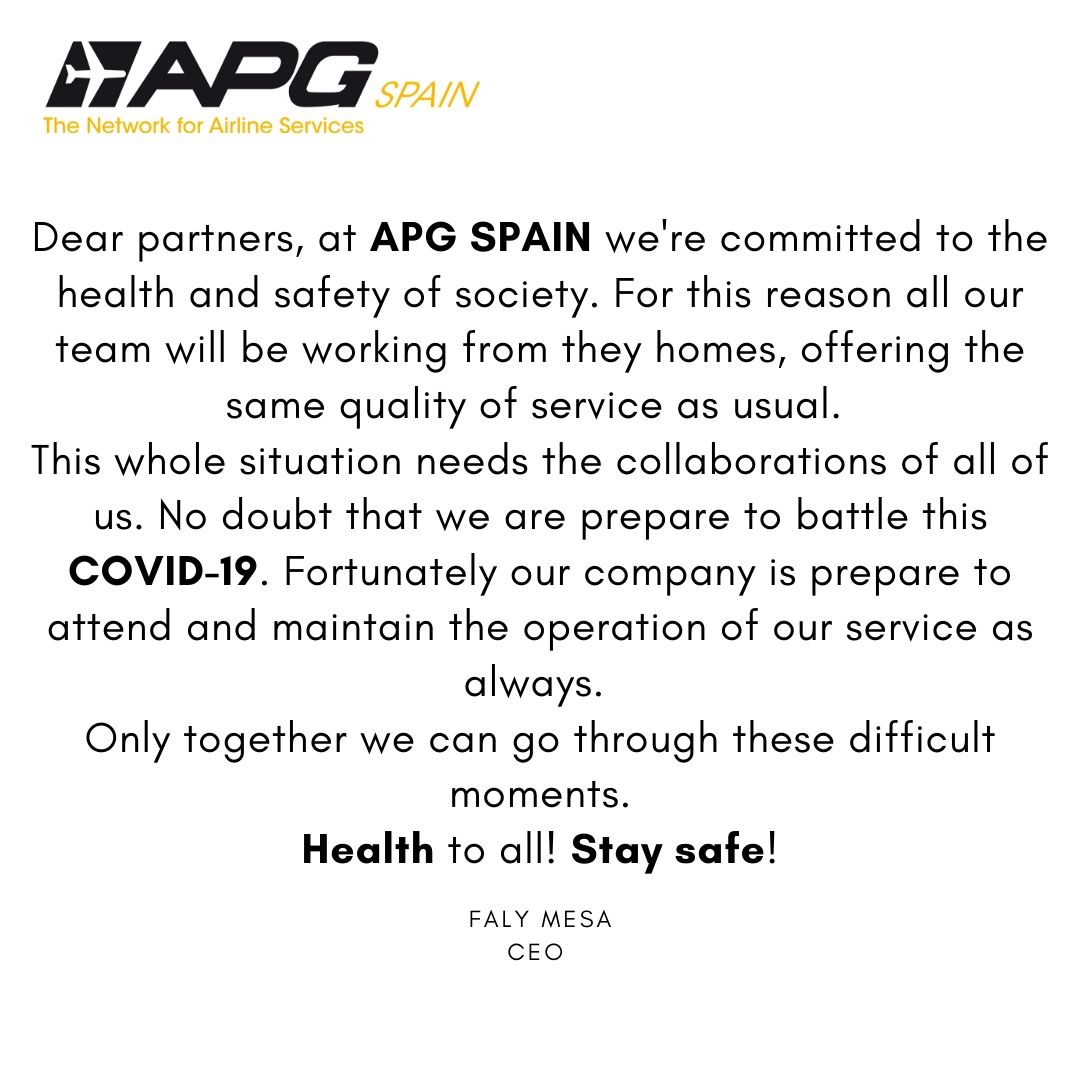 APG SPAIN – COVID19 By apgspain apg Posted 16/03/2020 In Uncategorized APG SPAIN – COVID192020-03-162020-03-16https://www.apg-spain.com/wp-content/uploads/2022/03/apg_white-1.pngAPG Spainhttps://www.apg-spain.com/wp-content/uploads/2022/03/apg_white-1.png200px200px 0 apgspain apg Recent PostsMAGAZINE THIRD QUARTER 2025MAGAZINE SECOND QUARTER 2025KENYA AIRWAYS comunicado **Handling of Disrupted PNRS -Agents Notice 014b – 19 November 2025 – UPDATE **MAGAZINE FIRST QUARTER 2025